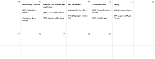 Throughout the month, participants will have opportunities to try new hobbies and recreational activities, spend time outdoors, and engage in hands‑on experiences such as planting and caring for plants. These activities support confidence, responsibility, choice‑making, and enjoyment while encouraging curiosity and participation.